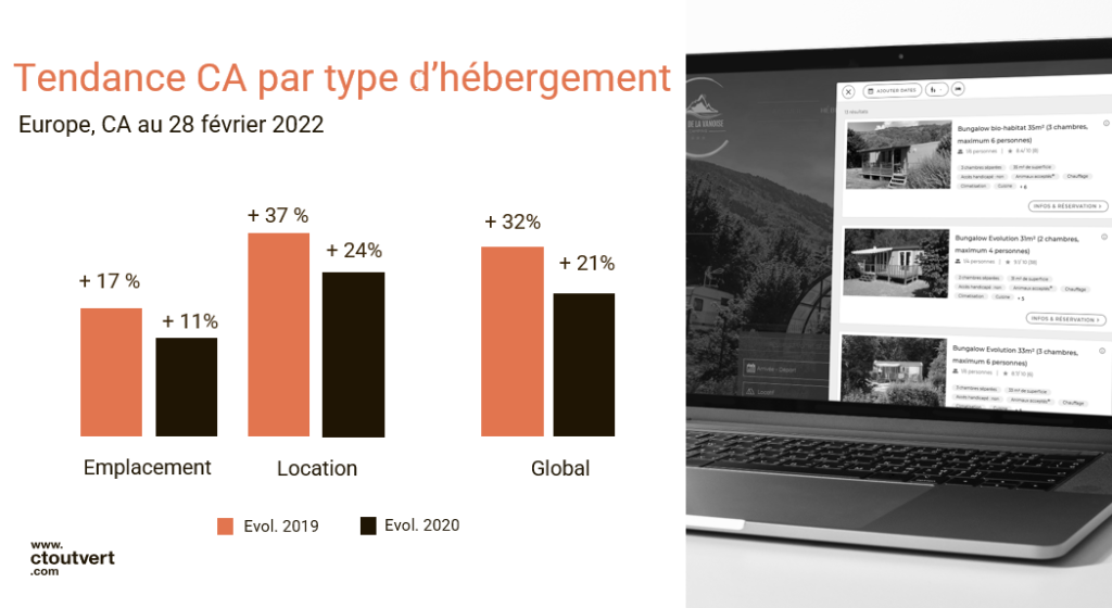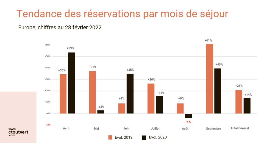 Le rythme des réservations au mois de février a été exceptionnel. Le panel progresse globalement de 21% par rapport à 2019 et de14% par rapport à 2020, en nombre de réservations. En CA la hausse est de 32% par rapport à 2019 et de 21% comparée à 2020.