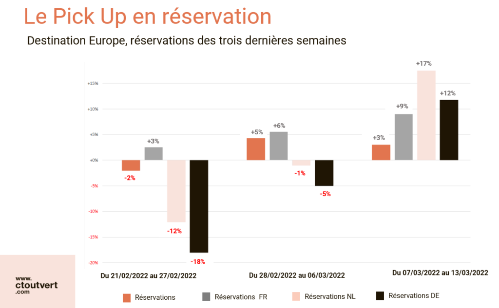 Les chiffres de chaque semaine sont comparés avec celles de la semaine précédente. Le panier moyen des marchés allemands et néerlandais pèse sur cette évolution en chiffre d’affaires, mais s’aligne sur la tendance en réservation.